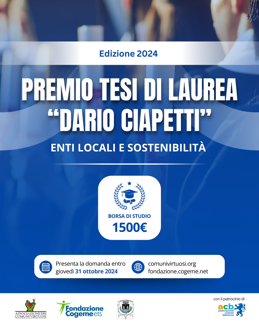 1 minutoL’associazione nazionale dei Comuni Virtuosi, in collaborazione con Fondazione Cogeme e il Comune di Berlingo, propone anche quest’anno il premio “Dario Ciapetti”, nell’intento di incoraggiare e sviluppare gli studi inerenti a una visione sostenibile e integrata di governo del territorio.