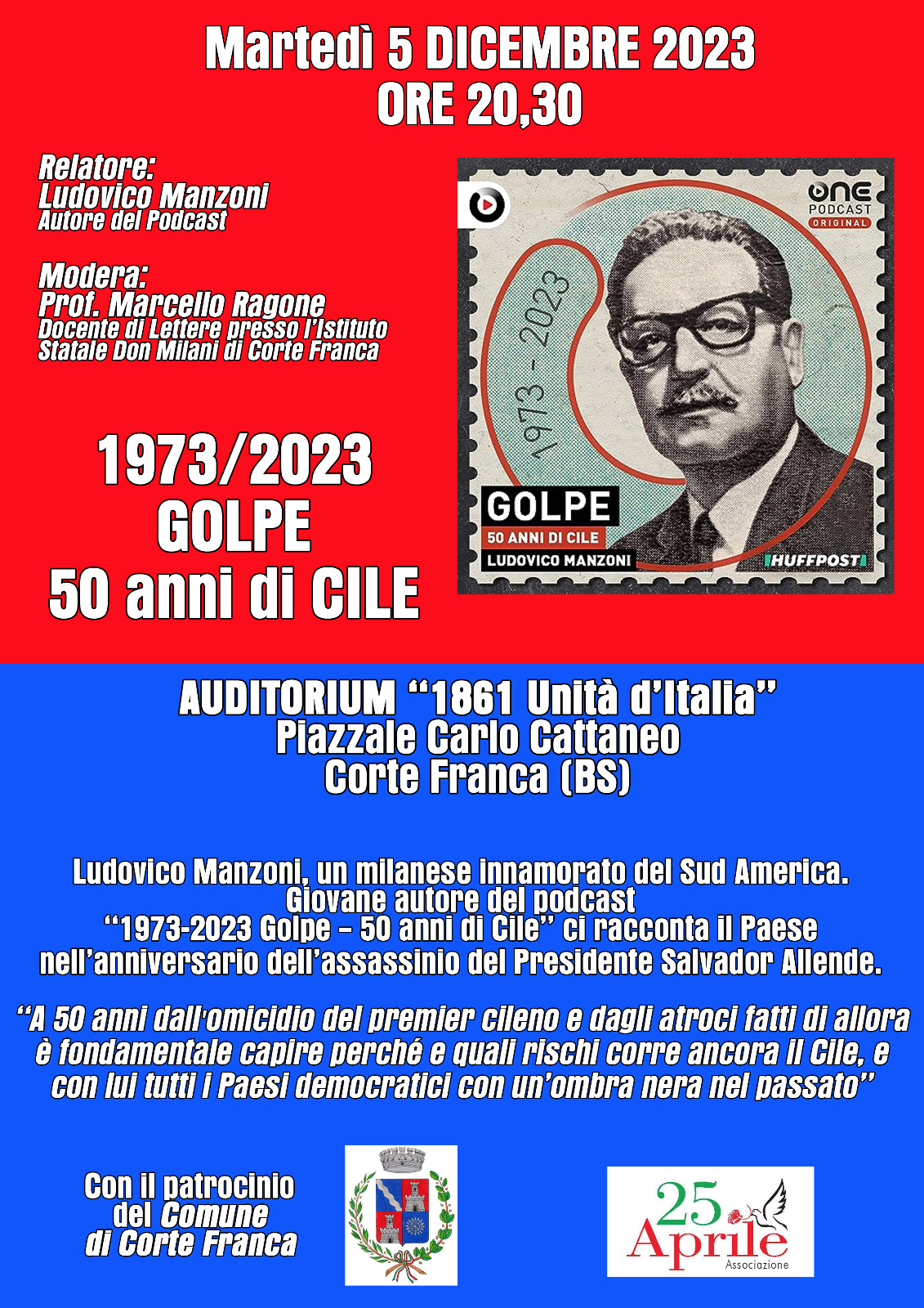 Martedì 5 dicembre 2023 presso l'Auditorium "1861 Unità d'Italia" Ludovico Manzoni, giovane autore del podcast "1973-2023 Golpe - 50 anni di Cile" ci racconta il Paese nell'anniversario dell'assassinio del Presidente Salvador Allende.