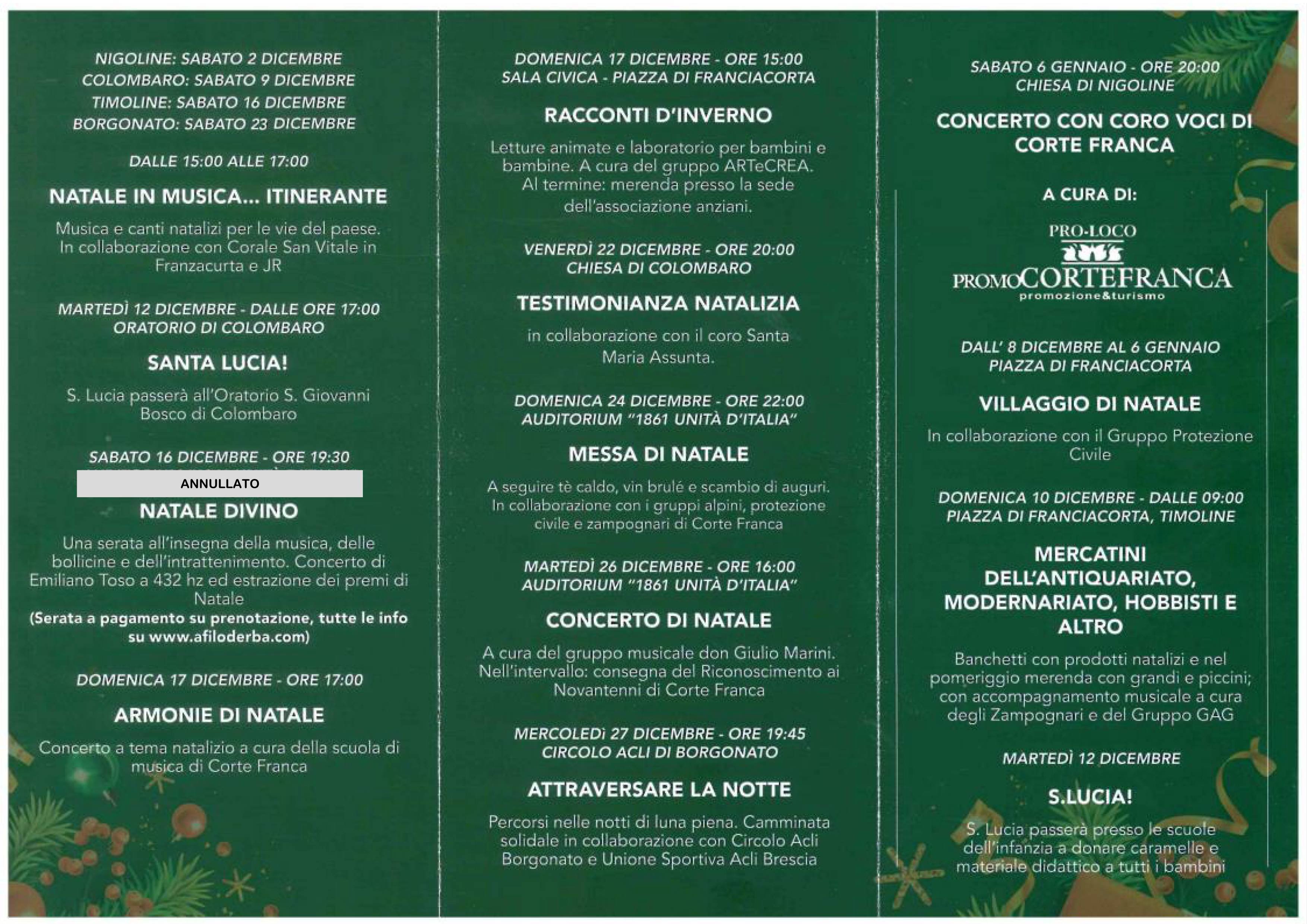 Ore 15:00 Sala Civica - Piazza di Franciacorta Racconti d'inverno Letture animate e laboratorio per bambini e bambine. A cura del gruppo ARTeCREA. Al termine: merenda presso la sede dell'associazione anziani. Armonie di Natale - Ore 17:00 Concerto a tema natalizio a cura della scuola di musica di Corte Franca.